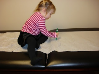 I love that Mia's at the coloring age because it gives the paper on the exam table a whole new role. The nurse gave her a pen and was amazed when Mia drew a circle and called it a circle, drew another circle and called it an oval, and the final circle was an OCAGON! (Octagon...Mia mistook a stop sign for a circle the other day, so I told her it was an octagon, now it's her fav new shape). The wait for the Dr was pleasant because Mia was all over that table drawing away and I spent a minute or two taking some pics of my little artist.